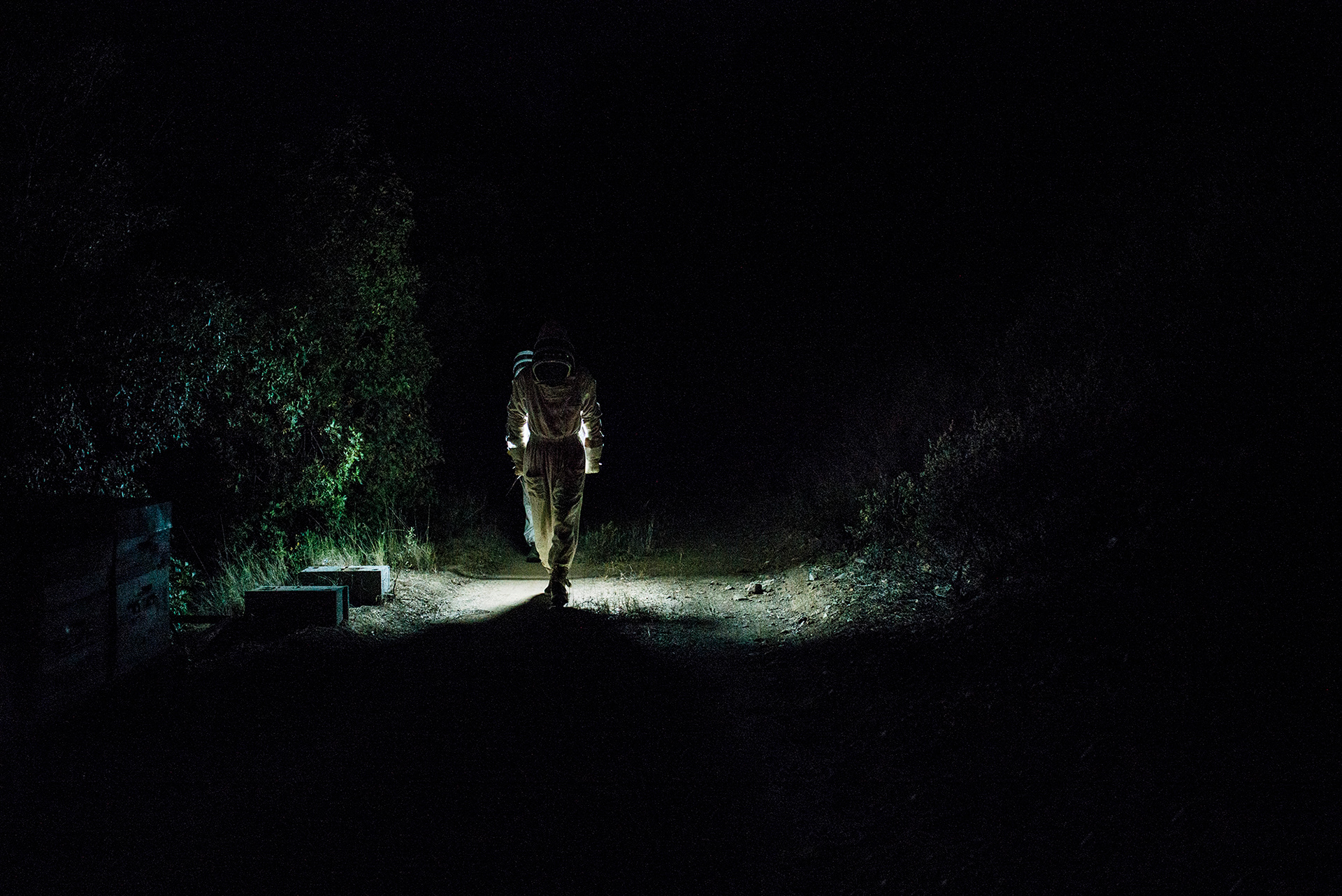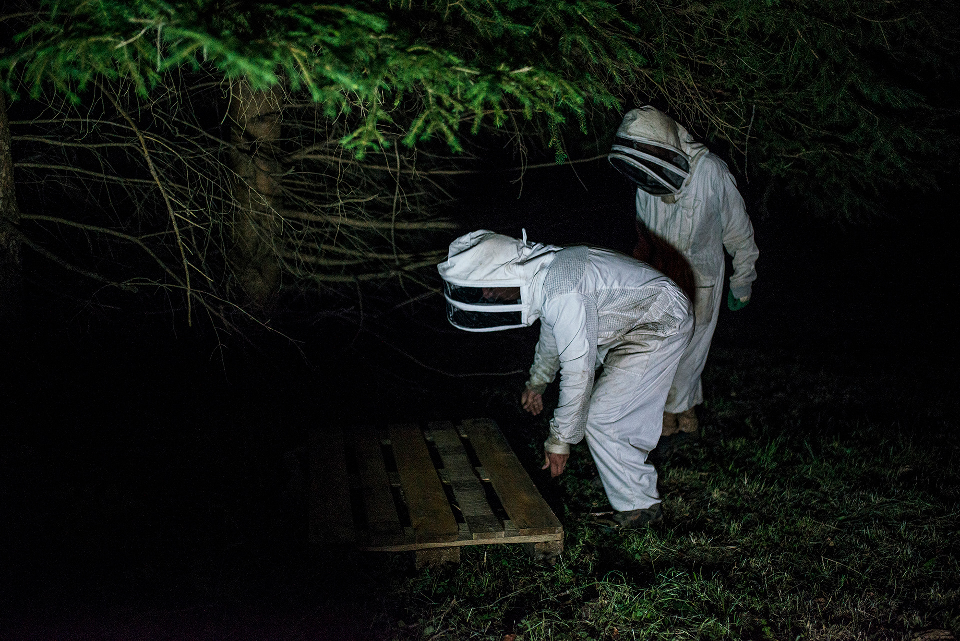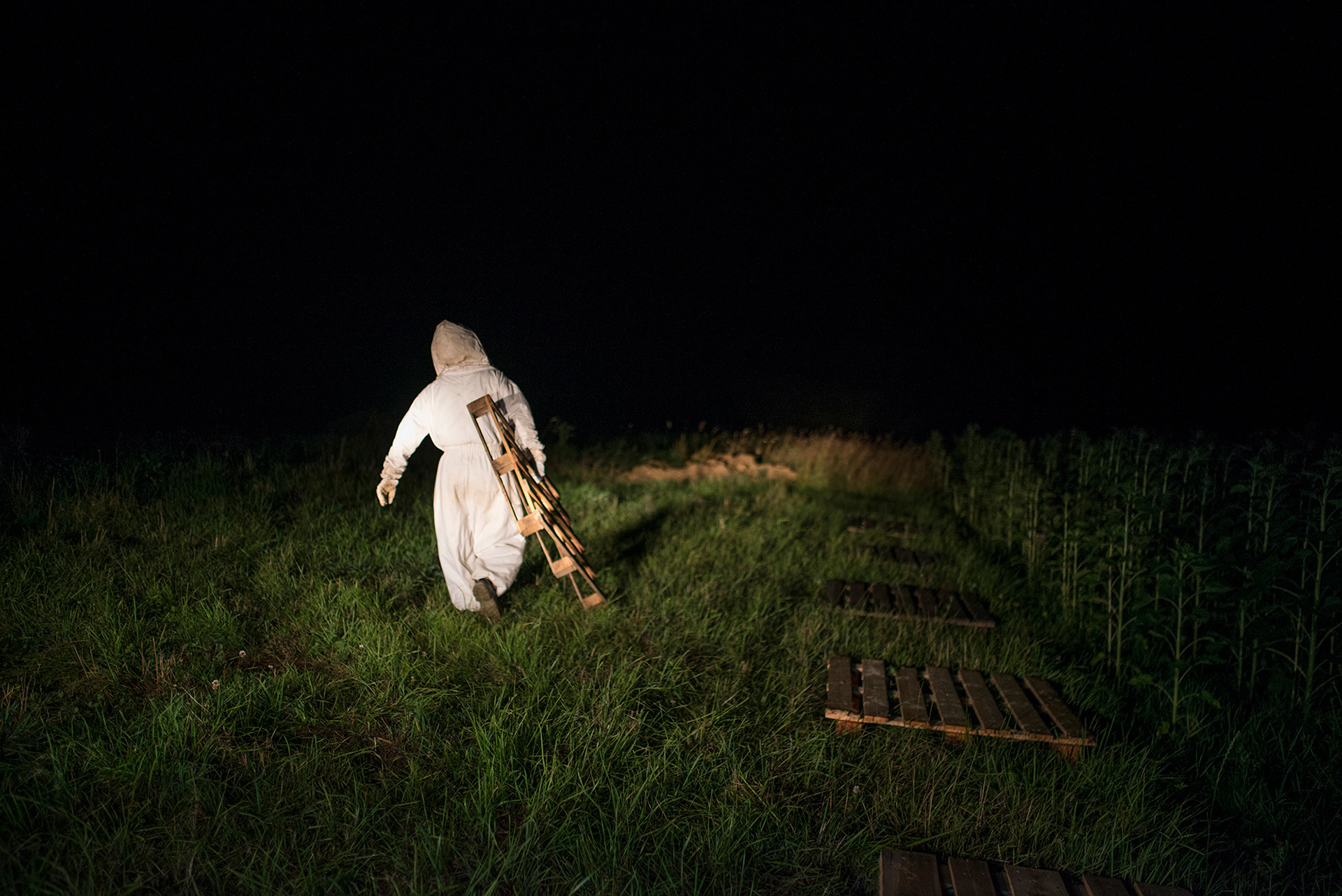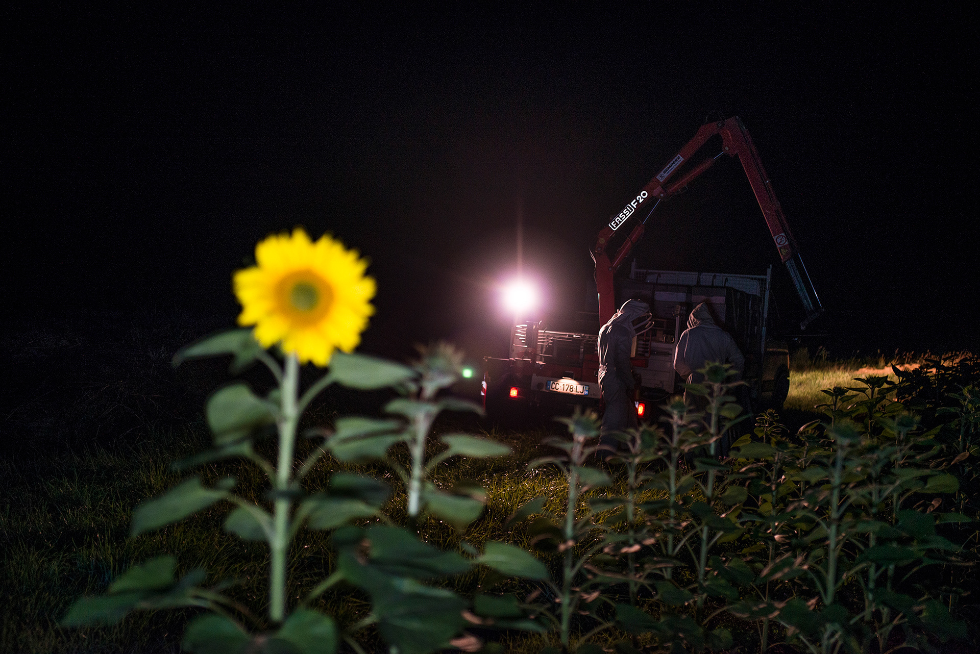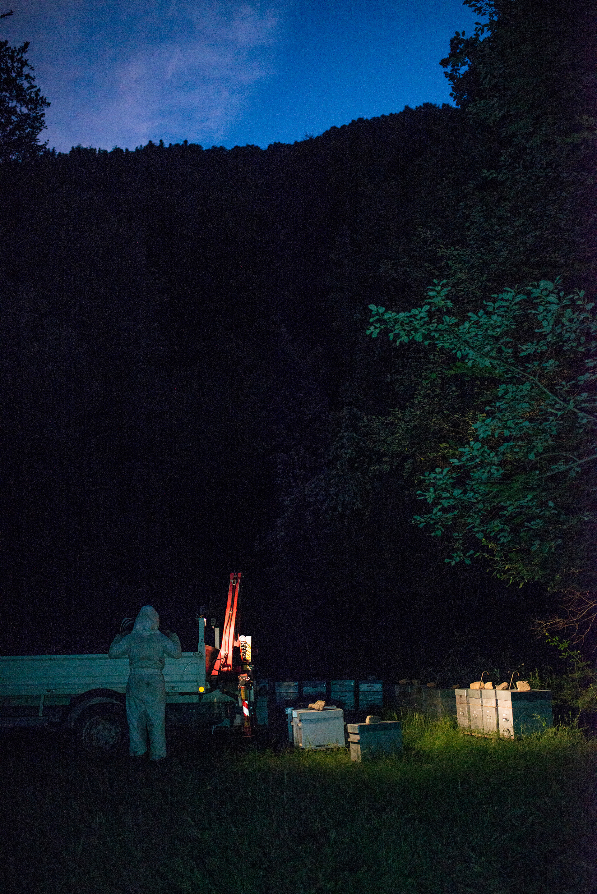 Il est tard, il n’y a personne sur les routes, on est seuls dans la forêt, on vit à la lumière des phares. On se sent ailleurs, et on sent qu’on fait quelque chose d’important, d’essentiel. On est costumés, et ça me plaît. Les apiculteurs eux transpirent parce que les ruches sont lourdes. Ils allument l’enfumoir qui permet d’inciter les abeilles à rentrer à l’intérieur des ruches, pour ne pas qu’elles se perdent pendant le déménagement. Ensuite il faut tout amarrer consciencieusement au camion, et surtout ne pas oublier une ruche dans la nuit.