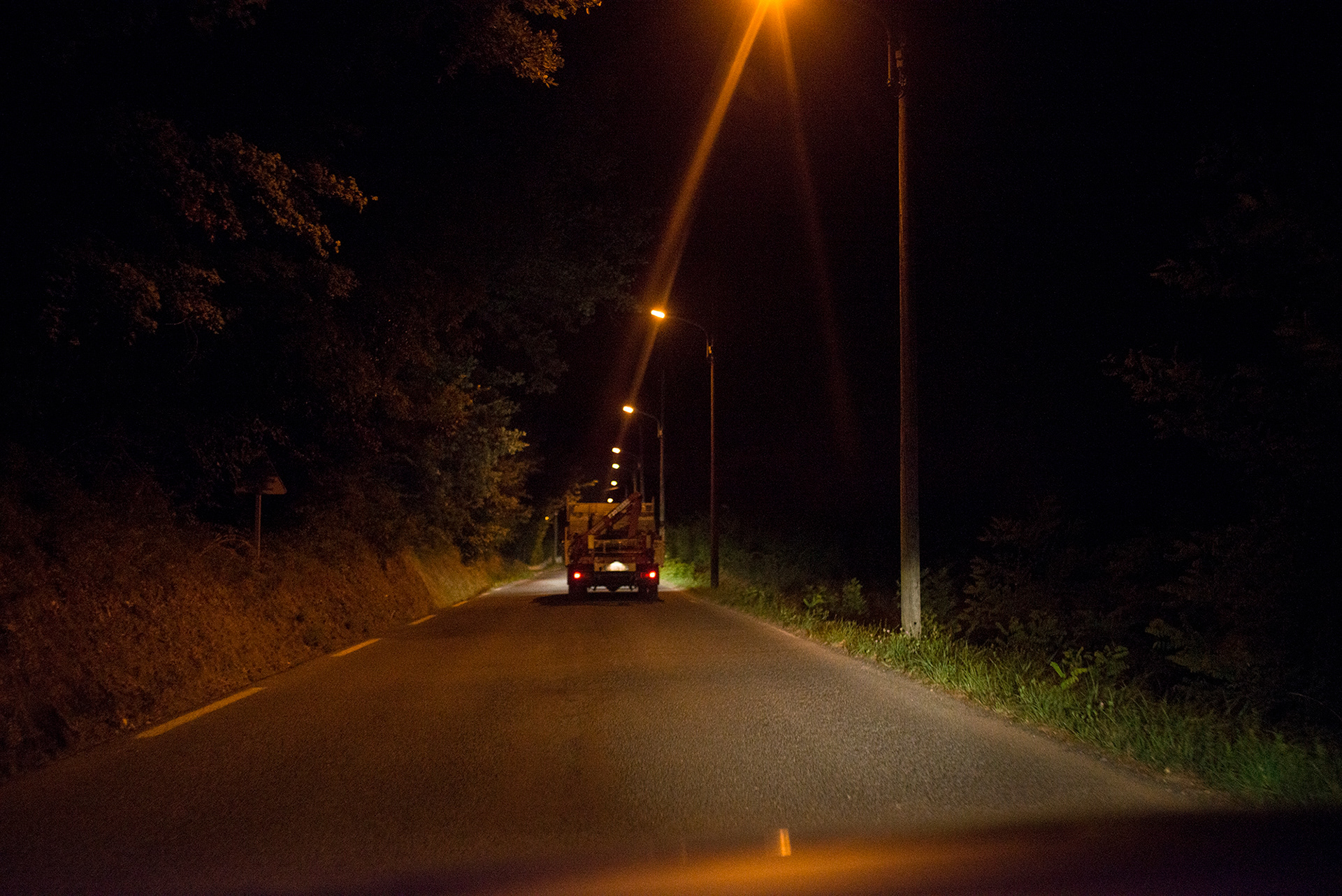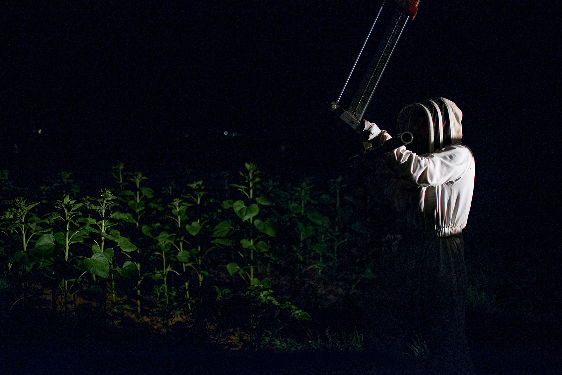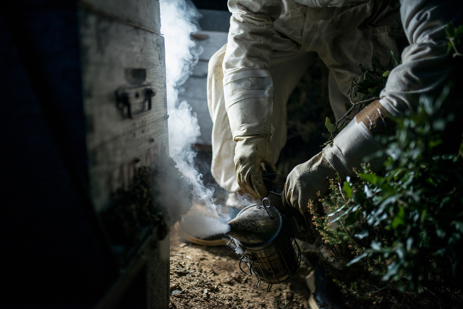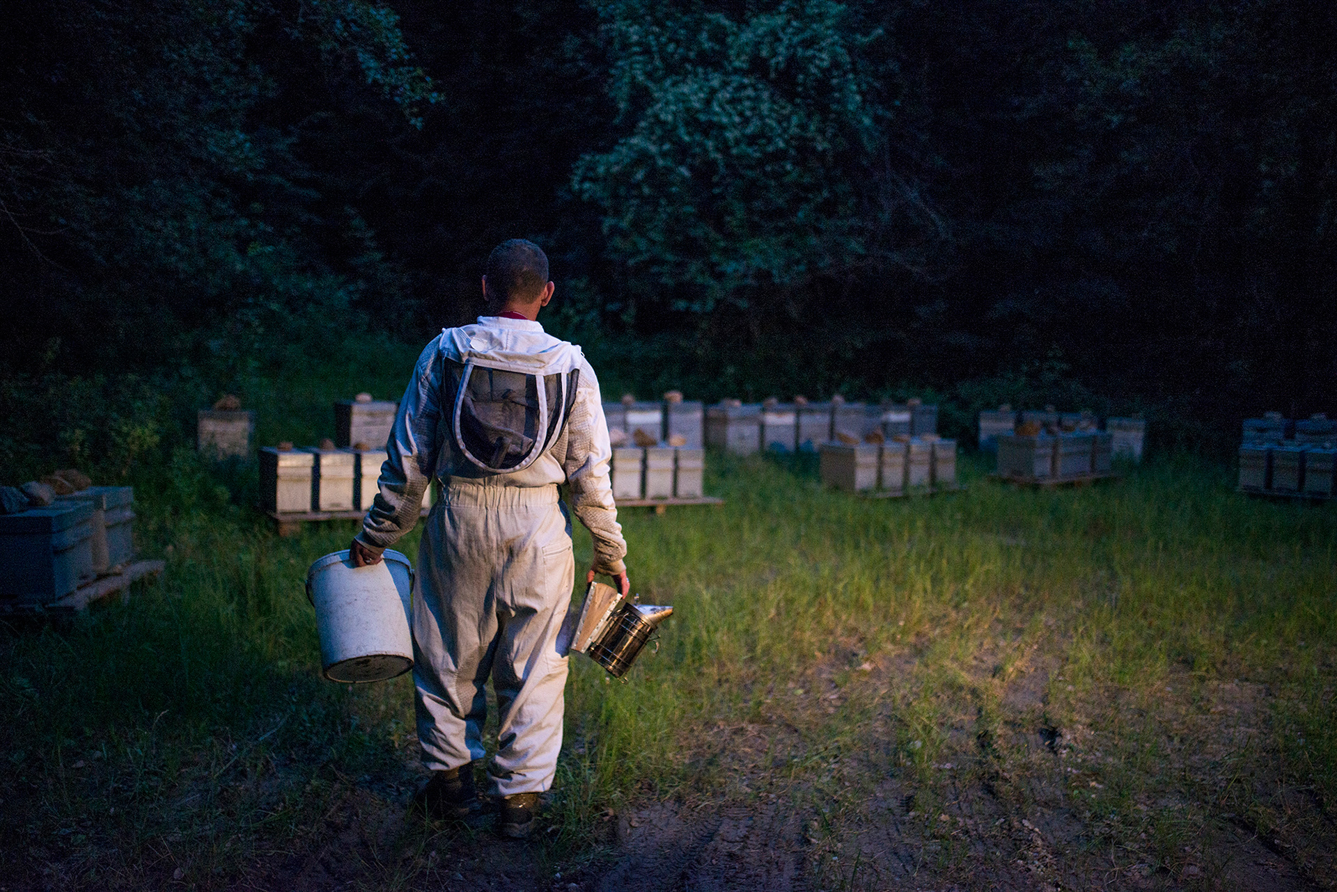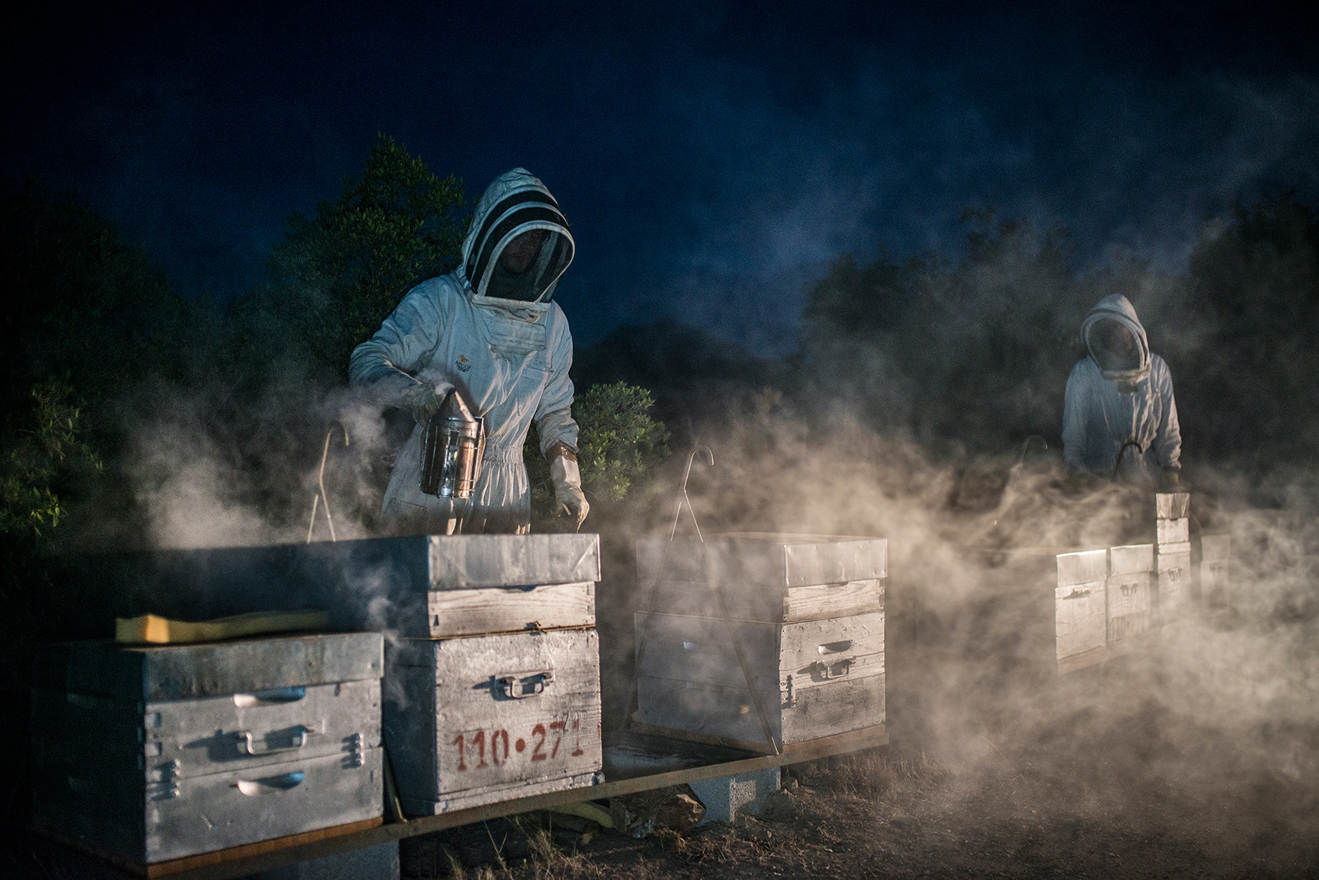 Il est tard, il n’y a personne sur les routes, on est seuls dans la forêt, on vit à la lumière des phares. On se sent ailleurs, et on sent qu’on fait quelque chose d’important, d’essentiel. On est costumés, et ça me plaît. Les apiculteurs eux transpirent parce que les ruches sont lourdes. Ils allument l’enfumoir qui permet d’inciter les abeilles à rentrer à l’intérieur des ruches, pour ne pas qu’elles se perdent pendant le déménagement. Ensuite il faut tout amarrer consciencieusement au camion, et surtout ne pas oublier une ruche dans la nuit.